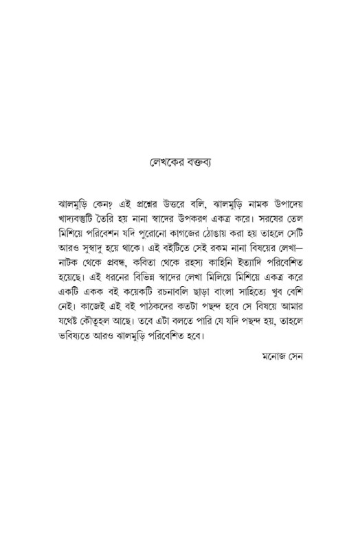 জনপ্রিয় লেখক মনোজ সেনের পাঠকদের অনেকেরই ধারণা যে তিনি ভূতের গল্প এবং ডিটেকটিভ গল্পই লিখে থাকেন। মাঝে মাঝে থ্রিলারের গল্পও তাঁর কাছ থেকে পাওয়া যায় কিন্তু তিনি যে আরও অনেক দরজায় কড়া নেড়েছেন তার সঙ্গে পরিচয় করিয়ে দেওয়ার জন্যই এই বইয়ের অবতারণা। মনোজ সেনের জনপ্রিয় ডিটেকটিভ রহস্য সন্ধানী দময়ন্তীর একটি দুষ্প্রাপ্য কাহিনি সহ অন্যান্য গল্প, প্রবন্ধ, নাটক, অনুবাদ, কবিতা ইত্যাদি কয়েকটি বিভাগের লেখা একত্র করে এই বইয়ে দেওয়া হয়েছে। লেখক জানিয়েছেন যে এই রচনাগুলি পুরোনো লেখা। মাঝখানে হারিয়ে গিয়েছিল। ‘বুক ফার্ম’ সেসব হারিয়ে যাওয়া লেখা বই আকারে ফিরিয়ে নিয়ে এল।