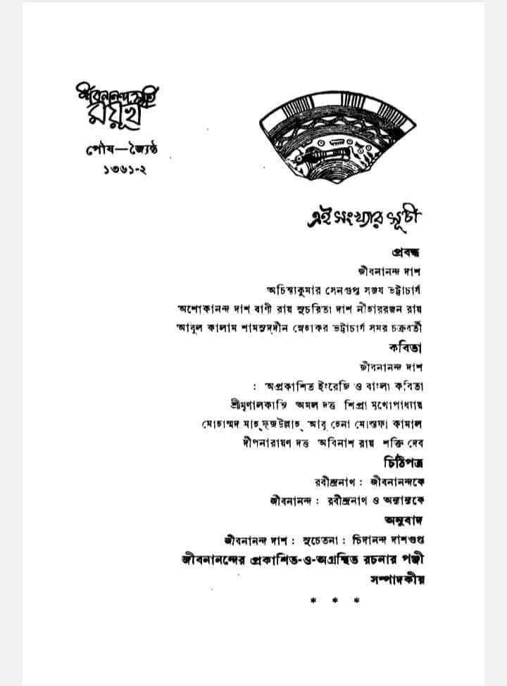 [১৯৫৪ সালে জীবনানন্দের অকাল প্রয়াণের পর প্রকাশিত হয়েছিল ‘ঊষা’, বুব-র ‘কবিতা’ এবং ভূমেন্দ্র গুহ-জগদিন্দ্র মণ্ডলদের ‘ময়ূখ’-এর ‘জীবনানন্দস্মৃতি’ সংখ্যা। আর সব পত্রিকার প্রসঙ্গ ফিকে হয়ে এলেও ‘ময়ূখ’ জীবনানন্দ সংখ্যার গুরুত্ব গবেষকের কাছে, অনুসন্ধিৎসু পাঠকের কাছে আজও অম্লান। বলা যায় এই একটি সংখ্যার জন্যই সে-পত্রিকার নাম বাংলা কবিতার ইতিহাসে অমর হয়ে থাকবে।