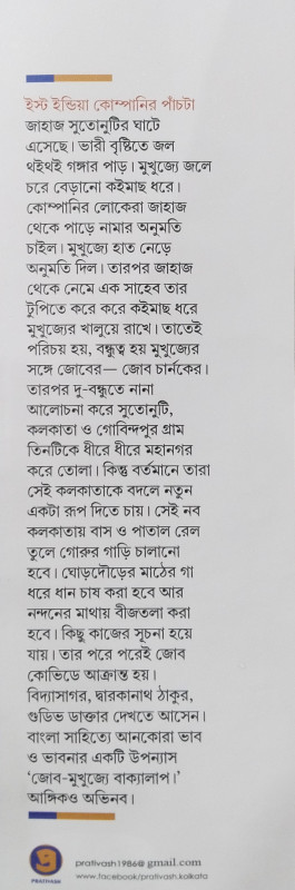 ইস্ট ইন্ডিয়া কোম্পানির পাঁচটা জাহাজ সুতোনুটির ঘাটে এসেছে। ভারী বৃষ্টিতে জল থইথই গঙ্গার পাড়। মুখুজ্যে জলে চরে বেড়ানো কইমাছ ধরে। কোম্পানির লোকেরা জাহাজ থেকে পাড়ে নামার অনুমতি চাইল। মুখুজ্যে হাত নেড়ে অনুমতি দিল। তারপর জাহাজ থেকে নেমে এক সাহেব তার টুপিতে করে করে কইমাছ ধরে মুখুজ্যের খালুয়ে রাখে। তাতেই পরিচয় হয়, বন্ধুত্ব হয় মুখুজ্যের সঙ্গে জোবের– জোব চার্নকের। তারপর দু-বন্ধুতে নানা আলোচনা করে সুতোনুটি, কলকাতা ও গোবিন্দপুর গ্রাম তিনটিকে ধীরে ধীরে মহানগর করে তোলে। কিন্তু বর্তমানে তারা সেই কলকাতাকে বদলে নতুন একটা রূপ দিতে চায়। সেই নব কলকাতায় বাস ও পাতাল রেল তুলে গোরুর গাড়ি চালানো হবে। ঘোড়দৌড়ের মাঠের গা ধরে ধান চাষ করা হবে আর নন্দনের মাথায় বীজতলা করা হবে। কিছু কাজের সূচনা হয়ে যায়। তার পরে পরেই জোব কোভিডে আক্রান্ত হয়। বিদ্যাসাগর, দ্বারকানাথ ঠাকুর, গুডিভ ডাক্তার দেখতে আসেন। বাংলা সাহিত্যে আনকোরা ভাব ও ভাবনার একটি উপন্যাস ‘জোব মুখুজ্যে বাক্যালাপ’। অভিনব আঙ্গিক।