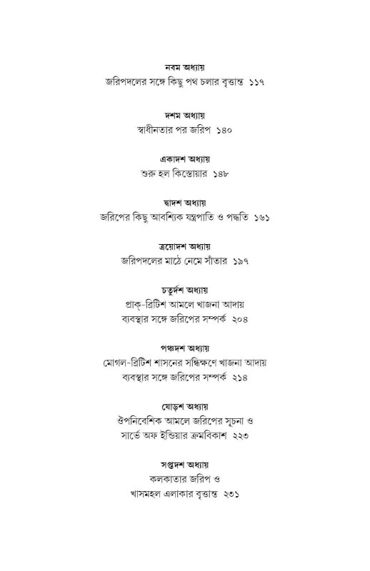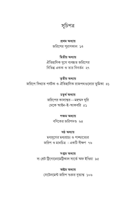আধুনিক যুগের যন্ত্রের অবদান তো আরও আশ্চর্যের। গান্টার্স চেন থেকে শুরু করে আজকের ডিজিটাল ম্যাপ অবধি এই দীর্ঘ যাত্রার কথা রয়েছে এই গ্রন্থে। রয়েছে মোগল জরিপ থেকে সার্ভে অফ ইন্ডিয়া হয়ে আন্তর্জাতিক সীমান্ত জরিপের কথা। কলকাতা জরিপের অনুপুঙ্খ ইতিহাসকেও ধরা হল বিশদভাবে। বলা রইল সেইসব কালজয়ী জরিপবিদদের কাহিনিও—জীবনমৃত্যু ছিল যাঁদের কাছে পায়ের ভৃত্য।