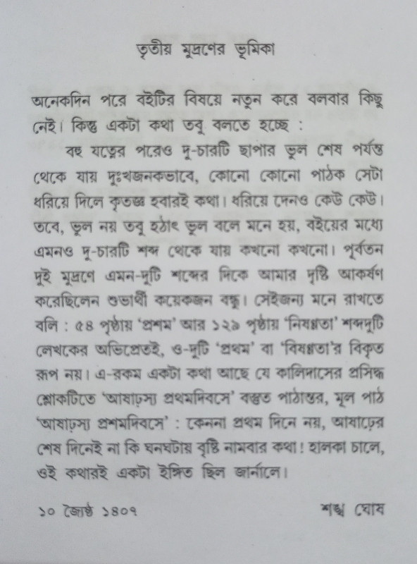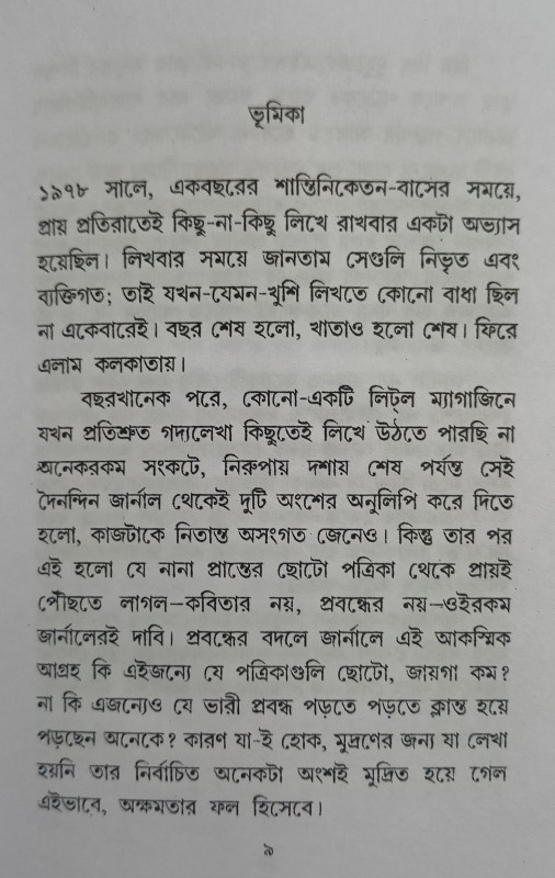 "১৯৭৮ সালে, একবছরের শান্তিনিকেতন-বাসের সময়ে, প্রায় প্রতিরাতেই কিছু-না-কিছু লিখে রাখবার একটা অভ্যাস হয়েছিল। লিখবার সময়ে জানতাম সেগুলি নিভৃত এবং ব্যক্তিগত; তাই যখন-যেমন-খুশি লিখতে কোনো বাধা ছিল না একেবারেই। বছর শেষ হলো, খাতাও হলো শেষ। ফিরে এলাম কলকাতায়।