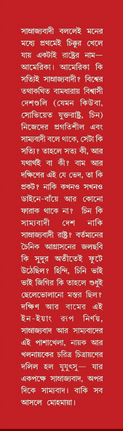 সাম্রাজ্যবাদী বললেই মনের মধ্যে প্রথমেই চিকুর খেলে যায় একটাই রাষ্ট্রের নাম-আমেরিকা। আমেরিকা কি সত্যিই সাম্রাজ্যবাদী? বিশ্বের তথাকথিত বামধারায় বিশ্বাসী দেশগুলি (যেমন কিউবা, সোভিয়েত যুক্তরাষ্ট্র, চিন) নিজেদের প্রগতিশীল এবং সাম্যবাদী বলে থাকে, সেটা কি সত্যি? তাহলে সত্য কী, আর যথার্থই বা কী? বাম আর দক্ষিণের এই যে ভেদ, তা কি প্রকট? নাকি কখনও সখনও ডাইনে-বাঁয়ে আর কোনো ফারাক থাকে না? চিন কি সাম্যবাদী দেশ নাকি সাম্রাজ্যবাদী রাষ্ট্র? বর্তমানের চৈনিক আগ্রাসনের জলছবি কি সুদূর অতীতেই ফুটে উঠেছিল? হিন্দি, চিনি ভাই ভাই জিগির কি তাহলে শুধুই ছেলেভোলানো মন্তর ছিল? দক্ষিণ আর বামের এই ইন-ইয়াং রূপ নির্ণয়, সাম্রাজ্যবাদ আর সাম্যবাদের এই পাশাখেলা, নায়ক আর খলনায়কের চরিত্র চিত্রায়ণের দলিল হল যুযুৎসু- যার একপক্ষে সাম্রাজ্যবাদ, অপর দিকে সাম্যবাদ। বাকি সব আসলে মোহমায়া।