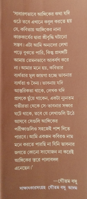 "যে সকল কবিতায় প্রথাগত ভাষা ও ছন্দের অনুসরণ করা হয় সেখানে অদ্ভুত যাহিরের দিক থেকে পাঠকদের চলতে ফিরতে বাধে না। কিন্তু কখনো কখনো বিশেষ কোনো রসের অনুসন্ধানে কবি অভ্যাসের পথ অতিক্রম করে থাকে। তখন অন্তত কিছুকালের জন্য পাঠকের আরামের ব্যাঘাত ঘটে ব'লে তারা নতুন রসের আমনানীকে অস্বীকার ক'রে শাস্তি জ্ঞাপন করে। চলতে চলতে যে পর্যন্ত পথ চিহ্নিত হয়ে না যায় সে পর্যন্ত পথকর্তার বিরুদ্ধে পথিকদের একটা ঝগড়া সৃষ্টি হয়ে ওঠে। সেই অশান্তির সময়টাতে করি স্পর্ধা প্রকাশ করে, বলে, 'তোমাদের চেয়ে আমার মতই প্রামাণিক।' পাঠকরা বলতে থাকে, যে লোকটা জোগান দেয় তার চেয়ে যে লোক ভোগ করে তারই দাবীর জোর বেশী। কিন্তু ইতিহাসে তার প্রমাণ হয় না। চিরদিনই দেখা গেছে, নূতনকে উপেক্ষা করতে করতেই নূতনের অভ্যর্থনার পথ প্রশস্ত হয়েছে।"-রবীন্দ্রনাথ ঠাকুর
