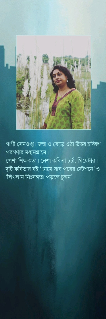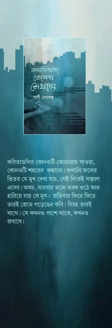 কবিতাগুলির কোনওটি জ্যোৎস্নায় পাওয়া, কোনওটি শহরের কঙ্কালে। রুপালি জলের ভিতর যে মুখ দেখা যায়, সেই দিকেই সন্তরণ এদের। অথচ, বারবার জলে তরঙ্গ ওঠে আর হারিয়ে যায় সে মুখ। প্রতিবার ফিরে ফিরে তারই প্রেমে পড়েছেন কবি। বিরহ তারই সাথে। সে কখনও পাশে থাকে, কখনও প্রবাসে।