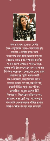 জন্ম ৪ঠা জুন, ১৯৮৫। পেশায় জৈব-প্রযুক্তিবিদ হলেও ভালবাসার দুই পাত্র — বই ও শাস্ত্রীয় নৃত্য। সঙ্গে ভাল লাগে নানা জানা অজানা জায়গায় বেড়াতে যেতে এবং সেখানকার স্থানীয় খাবার-চেখে দেখতে। পাহাড়, সমুদ্র, জঙ্গল সবই ছুঁয়ে দেখেছেন এবং তা পাতায় লিপিবদ্ধ করেছেন। বেড়ানোর লেখা প্রথম প্রকাশিত হয় 'ছুটি' নামে একটি ভ্রমণ-পত্রিকায়, বছর তিনেক আগে। তারপর রংরুট, চল যাই, ভ্রমণপিপাসু ইত্যাদি বিভিন্ন ছোট-বড় পত্রিকা, ওয়েবজিনে ও ব্লগে ভ্রমণকাহিনী লিখেছেন। লিখেছেন ব্যক্তিগত গদ্য, রম্যরচনা এবং ছোট গল্প। পাঠকসত্ত্বার পাশাপাশি লেখকসত্ত্বাকে বাঁচিয়ে রাখার আপ্রাণ চেষ্টায় গত ছয় বছর ধরে ব্রতী।