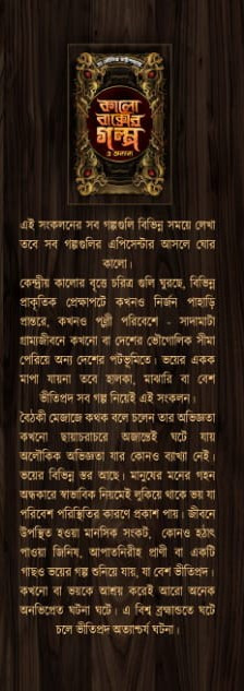 কেন্দ্রীয় কালোর বৃত্তে চরিত্র গুলি ঘুরছে, বিভিন্ন প্রাকৃতিক প্রেক্ষাপটে কখনও নির্জন পাহাড়ি প্রান্তরে, কখনও পুরী পরিবেশে সাদামাটা গ্রাম্যজীবনে কখনো বা দেশের ভৌগোলিক সীমা পেরিয়ে অন্য দেশের পটভূমিতে। ভয়ের একক মাপা যায়না তবে হালকা, মাঝারি বা বেশ ভীতিপ্রদ সব গল্প নিয়েই এই সংকলন।