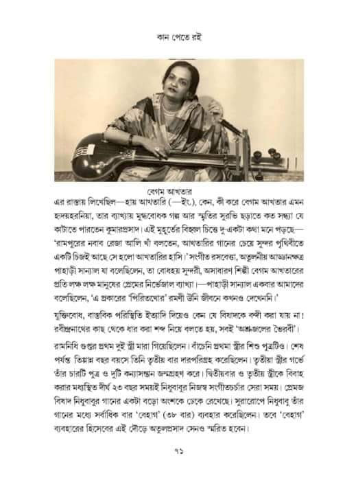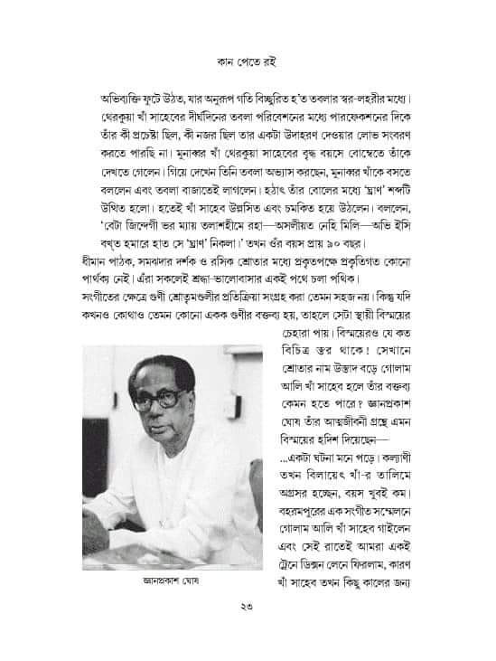 বহু গুণী সংগীতশিল্পীর শেষ জীবনে আর্থিক অস্বাচ্ছল্য, ডকুমেন্টেশানের অভাবে বহু গান-এর হারিয়ে যাওয়া, অনাদরে বহু সংগীতশিল্পীর প্রয়াণ— আমাদের দেশ-কাল-সমাজের অবহেলা-ক্লিষ্ট বিষণ্ণ সুরটি বেজে উঠেছে এই বইয়ের সুরে ও স্বরে।