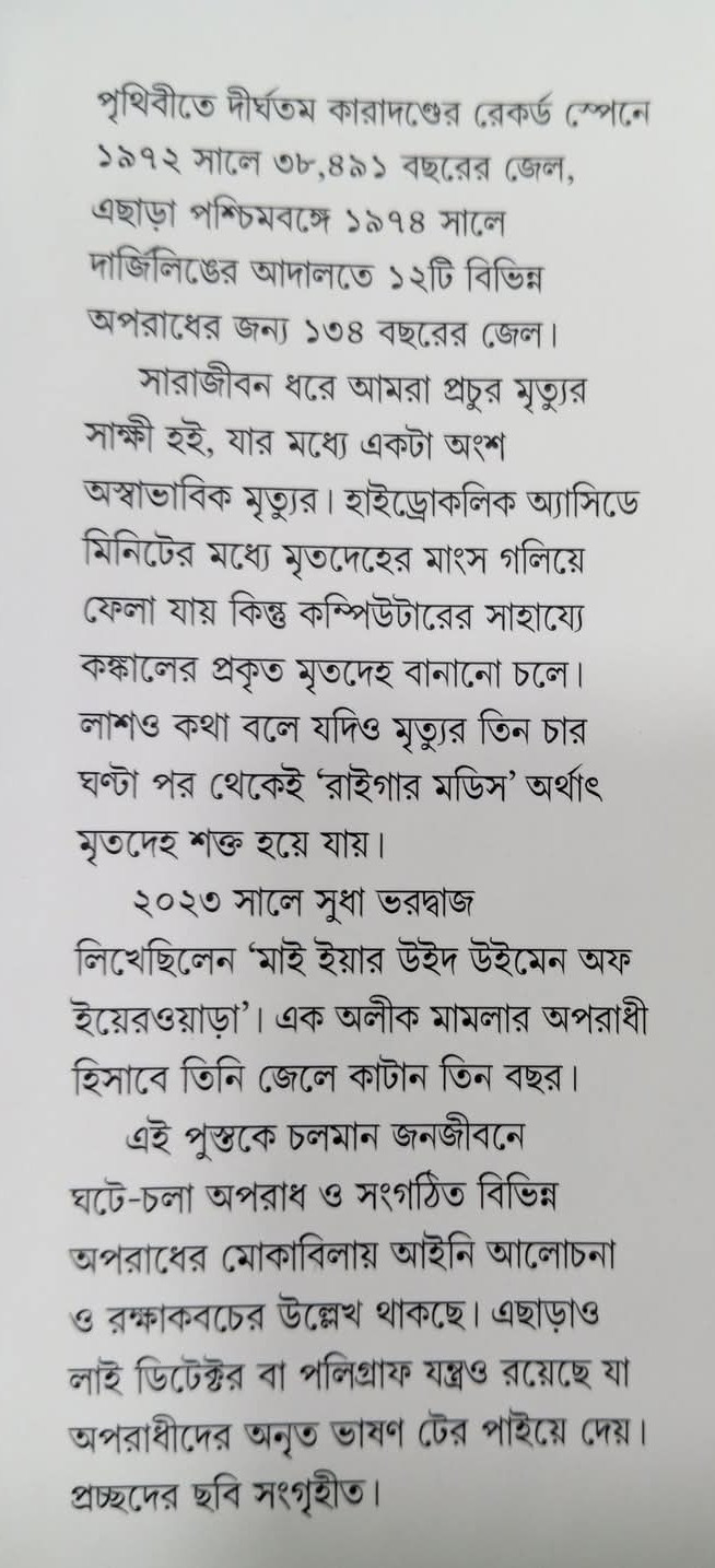এই পুস্তকে চলমান জনজীবনে ঘটে-চলা অপরাধ ও সংগঠিত বিভিন্ন অপরাধের মোকাবিলায় আইনি আলোচনা ও রক্ষাকবচের উল্লেখ থাকছে। এছাড়াও লাই ডিটেক্টর বা পলিগ্রাফ যন্ত্রও রয়েছে যা অপরাধীদের অনৃত ভাষণ টের পাইয়ে দেয়।