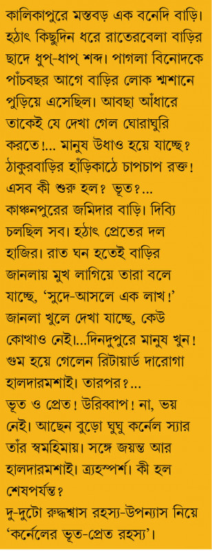 কালিকাপুরে মস্তবড় এক বনেদি বাড়ি। হঠাৎ কিছুদিন ধরে রাতেরবেলা বাড়ির ছাদে ধু-ধাপ্ শব্দ। পাগলা বিনোদকে পাঁচবছর আগে বাড়ির লোক শ্মশানে পুড়িয়ে এসেছিল। আবছা আঁধারে তাকেই যে দেখা গেল ঘোরাঘুরি করতে!... মানুষ উধাও হয়ে যাচ্ছে? ঠাকুরবাড়ির হাঁড়িকাঠে চাপচাপ রক্ত! এসব কী শুরু হল? ভূত?... কাঞ্চনপুরের জমিদার বাড়ি। দিব্যি চলছিল সব। হঠাৎ প্রেতের দল হাজির। রাত ঘন হতেই বাড়ির জানলায় মুখ লাগিয়ে তারা বলে যাচ্ছে, 'সুদে-আসলে এক লাখ!' জানলা খুলে দেখা যাচ্ছে, কেউ কোত্থাও নেই।... দিনদুপুরে মানুষ খুন! গুম হয়ে গেলেন রিটায়ার্ড দারোগা হালদারমশাই। তারপর?... ভূত ও প্রেত! উরিব্বাপ! না, ভয় নেই। আছেন বুড়ো ঘুঘু কর্নেল স্যার তাঁর স্বমহিমায়। সঙ্গে জয়ন্ত আর হালদারমশাই। এ্যহস্পর্শ। কী হল শেষপর্যন্ত? দু-দুটো রুদ্ধশ্বাস রহস্য-উপন্যাস নিয়ে 'কর্নেলের ভূত-প্রেত রহস্য'।