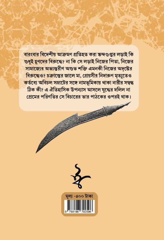 বারংবার বিদেশীয় আক্রমণ প্রতিহত করা স্কন্দগুপ্তর লড়াই কি শুধুই হুণদের বিরুদ্ধে? না কি সে লড়াই নিজের পিতা, নিজের সাম্রাজ্যের অভ্যন্তরীণ অশুভ শক্তি এমনকী নিজের অদৃষ্টের বিরুদ্ধেও? চক্রান্তের জালে মা, প্রেয়সীর নিদারুণ মৃত্যুতেও কর্তব্যে অবিচল সম্রাটের সঙ্গে নামভূমিকায় থাকা নারীর সম্বন্ধ ঠিক কী? এ ঐতিহাসিক উপন্যাস আসলে যুদ্ধের দলিল না প্রেমের পরিণতির সে বিচারের ভার পাঠকের ওপরই থাক।