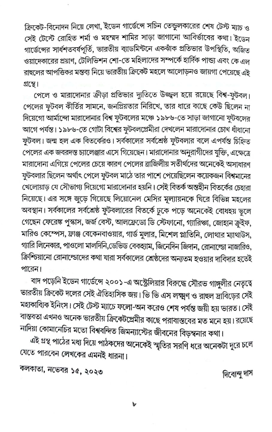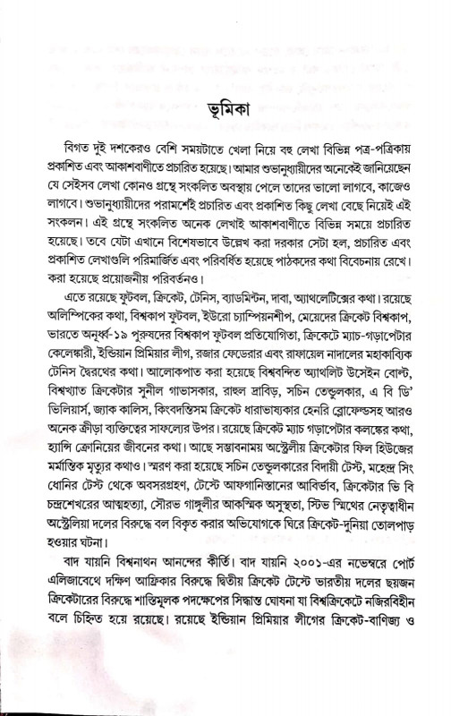 বিগত দুই দশকেরও বেশি সময়টাতে খেলা নিয়ে বহু লেখা বিভিন্ন পত্র-পত্রিকায় প্রকাশিত এবং আকাশবাণীতে প্রচারিত হয়েছে। আমার শুভানুধ্যায়ীদের অনেকেই জানিয়েছেন যে সেইসব লেখা কোনও গ্রন্থে সংকলিত অবস্থায় পেলে তাদের ভালো লাগবে, কাজেও লাগবে। শুভানুধ্যায়ীদের পরামর্শেই প্রচারিত এবং প্রকাশিত কিছু লেখা বেছে নিয়েই এই সংকলন। এই গ্রন্থে সংকলিত অনেক লেখাই আকাশবাণীতে বিভিন্ন সময়ে প্রচারিত হয়েছে। তবে যেটা এখানে বিশেষভাবে উল্লেখ করা দরকার সেটা হল, প্রচারিত এবং প্রকাশিত লেখাগুলি পরিমার্জিত এবং পরিবর্ধিত হয়েছে পাঠকদের কথা বিবেচনায় রেখে। করা হয়েছে প্রয়োজনীয় পরিবর্তনও।