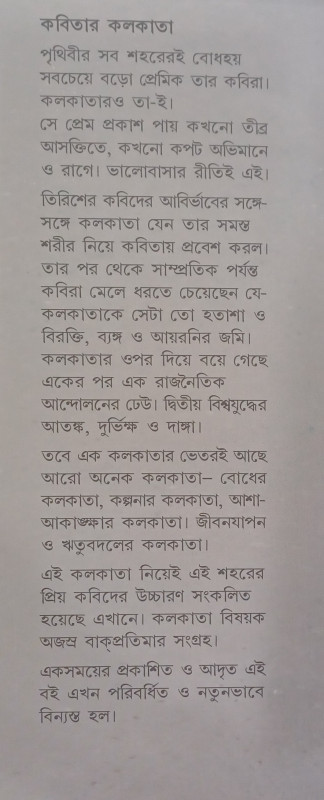 পৃথিবীর সব শহর নিয়েই রচিত হয়েছে কবিতা। শহরের প্রতি কবির প্রেম প্রকাশ পায় কখনো তীব্র আসক্তিতে, কখনো কপট অভিমানে, রাগে। কলকাতার উপর দিয়ে বয়ে গেছে নানা রাজনৈতিক আন্দোলনের ঢেউ, বিশ্বযুদ্ধের আতঙ্ক, দুর্ভিক্ষ, দাঙ্গা। আবার এই কলকাতার মধ্যেই আছে ভালোবাসার আর বোধের কলকাতা, কল্পনার, আশা-আকাঙ্ক্ষার কলকাতা। জীবনযাপনের ও ঋতুবদলের কলকাতা। এই শহর নিয়ে এই শহরের প্রিয় কবিদের কবিতার সঙ্কলন এই বই।