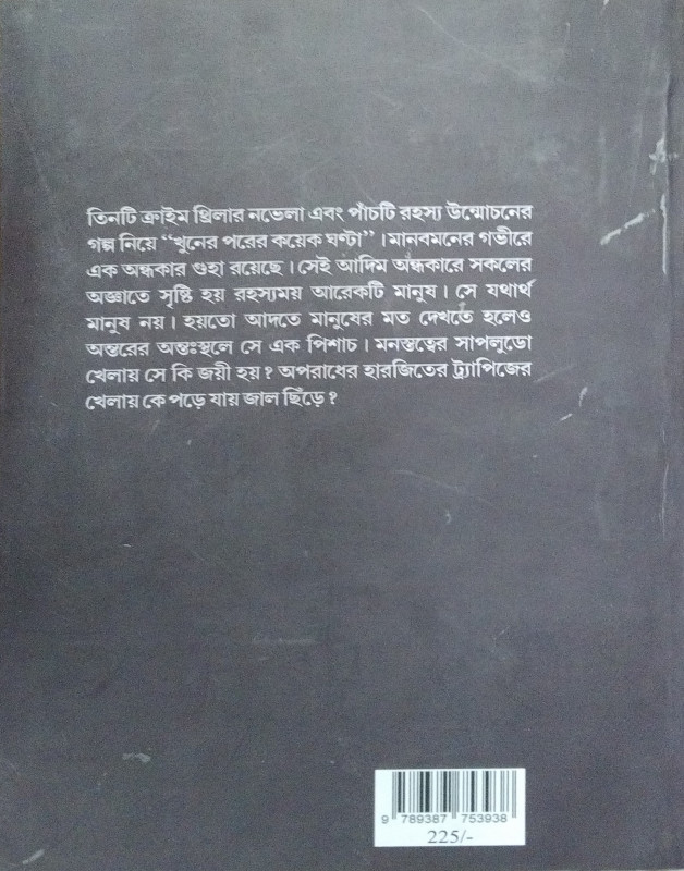তিনটি রহস্যময় নভেলা, পাঁচটি গল্প নিয়ে 'খুনের পরের কয়েক ঘণ্টা', তথাকথিত গোয়েন্দা কাহিনির উলটোদিকে হেঁটে রহস্যের জমাট বরফকে ভেঙে ফেলার কাহিনি। এখানে, যুক্তি, বুদ্ধি, পর্যবেক্ষণ নিঃশব্দে কাজ করে গিয়েছে। তাদের আলতো টোকায় ভেঙে পড়বে কি ঘন বুনোটে তৈরি কুয়াশার ভারী চাদর!! অপরাধী কি জানে পেছনে পায়ের শব্দটি কার??