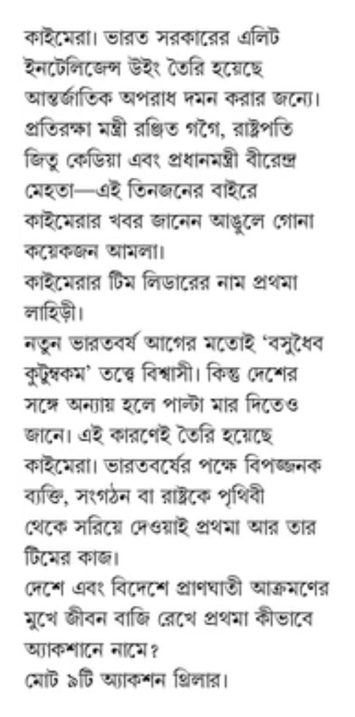 কাইমেরা। ভারত সরকারের এলিট ইনটেলিজেন্স উইং তৈরি হয়েছে আন্তর্জাতিক অপরাধ দমন করার জন্যে। প্রতিরক্ষা মন্ত্রী রঞ্জিত গগৈ, রাষ্ট্রপতি জিতু কেডিয়া এবং প্রধানমন্ত্রী বীরেন্দ্র মেহতা-এই তিনজনের বাইরে কাইমেরার খবর জানেন আঙুলে গোনা কয়েকজন আমলা।