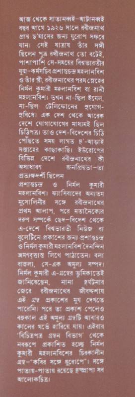 আজ থেকে সাতানব্বই-আটানব্বই বছর আগে ১৯২৬ সালে রবীন্দ্রনাথ প্রায় ছ'মাসের জন্য ঘুরোপ সফরে যান। সেই যাত্রায় তাঁর সঙ্গী ছিলেন পুত্র রথীন্দ্রনাথ তো বটেই, পাশাপাশি সে-সময়ের বিশ্বভারতীর যুগ্ম-কর্মসচিব প্রশান্তচন্দ্র মহলানবিশ ও তাঁর স্ত্রী, রবীন্দ্রনাথের পরম স্নেহের নির্মল কুমারী মহলানবিশ বা রানী মহলানবিশ। তখন না-ছিল ইমেল, না-ছিল টেলিফোনের সুযোগ-সুবিধে। এক দেশ থেকে আরেক দেশে যোগাযোগের মাধ্যমই ছিল চিঠিপত্র। তাও দেশ-বিদেশের চিঠি পৌঁছতে সময় লাগত ছ'-আড়াই সপ্তাহের কাছাকাছি। ইউরোপের বিভিন্ন দেশে রবীন্দ্রনাথের কী অসাধারণ প্রত্যক্ষদর্শী ছিলেন জনপ্রিয়তা-তা প্রশান্তচন্দ্র ও নির্মল কুমারী মহলানবিশ। ফ্যাসিবাদের অন্যতম। মুসোলিনীর সঙ্গে রবীন্দ্রনাথের প্রথম আলাপ, পরে মতানৈক্যের দরুণ সম্পর্কে ছেদ-বিদেশ থেকে এ-দেশে বিশ্বভারতী নিউজ বা বুলেটিনে প্রকাশের জন্য প্রশান্তচন্দ্র ও নির্মল কুমারী মহলানবিশ দৈনন্দিন ভ্রমণবৃত্তান্ত লিখে পাঠাতেন। বলা বাহুল্য, সে-এক অমূল্য সম্পদ। নির্মল কুমারী এ-গ্রন্থের ভূমিকাতেই জানিয়েছেন, নানা হুর্ঘটনার জেরে রবীন্দ্রনাথের জীবদ্দশায় এই গ্রন্থ প্রকাশের মুখ দেখতে পারেনি। পরে তা প্রকাশ পেলেও বহুকাল এই অমূল্য গ্রন্থটি আবারও কালের গর্ভে হারিয়ে যায়। এইবার বিচিত্রপত্র গ্রন্থন বিভাগ' থেকে নবরূপে প্রকাশিত হচ্ছে নির্মল কুমারী মহলানবিশের চিরকালীন গ্রন্থ-"কবির সঙ্গে মুরোপে'। সঙ্গে পাতায়-পাতায় রয়েছে কৃষ্প্রাপ্য সব আলোকচিত্র।
