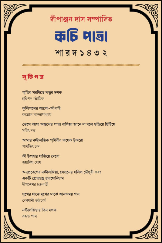 ‘কচি পাতা’ নিবেদিত ‘শারদ ১৪৩২’-এ সেই ভাবনারই ছোঁয়া পাওয়া যাবে। এবারের বিষয় নস্টালজিয়ার তিন দশক, সত্তর থেকে নব্বই।