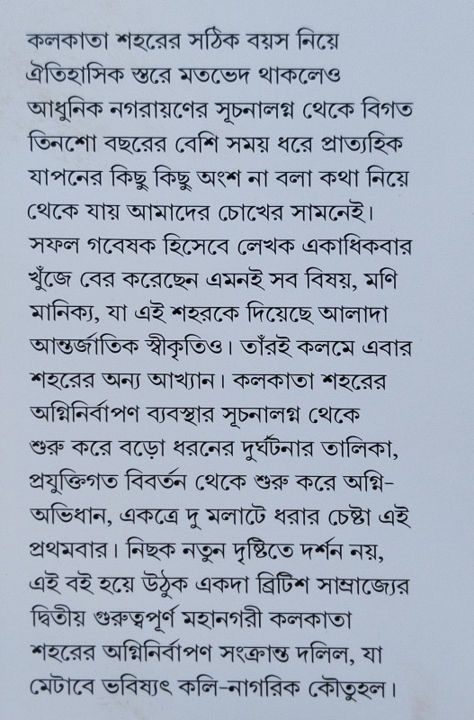 কলকাতা শহরের সঠিক বয়স নিয়ে ঐতিহাসিক স্তরে মতভেদ থাকলেও আধুনিক নগরায়ণের সূচনালগ্ন থেকে বিগত তিনশো বছরের বেশি সময় ধরে প্রাত্যহিক যাপনের কিছু কিছু অংশ না বলা কথা নিয়ে থেকে যায় আমাদের চোখের সামনেই। সফল গবেষক হিসেবে লেখক একাধিকবার খুঁজে বের করেছেন এমনই সব বিষয়, মণি মানিক্য, যা এই শহরকে দিয়েছে আলাদা আন্তর্জাতিক স্বীকৃতিও। তাঁরই কলমে এবার শহরের অন্য আখ্যান। কলকাতা শহরের অগ্নিনির্বাপণ ব্যবস্থার সূচনালগ্ন থেকে শুরু করে বড়ো ধরনের দুর্ঘটনার তালিকা, প্রযুক্তিগত বিবর্তন থেকে শুরু করে অগ্নি-অভিধান, একত্রে দু মলাটে ধরার চেষ্টা এই প্রথমবার। নিছক নতুন দৃষ্টিতে দর্শন নয়, এই বই হয়ে উঠুক একদা ব্রিটিশ সাম্রাজ্যের দ্বিতীয় গুরুত্বপূর্ণ মহানগরী কলকাতা শহরের অগ্নিনির্বাপণ সংক্রান্ত দলিল, যা মেটাবে ভবিষ্যৎ কলি-নাগরিক কৌতুহল।