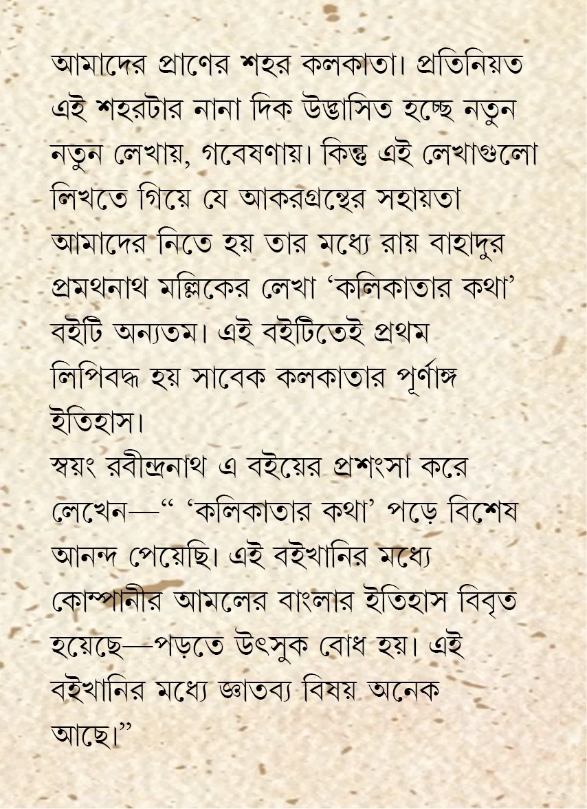 আমাদের প্রাণের শহর কলকাতা। প্রতিনিয়ত এই শহরটার নানা দিক উদ্ভাসিত হচ্ছে নতুন নতুন লেখায়, গবেষণায়। কিন্তু এই লেখাগুলো লিখতে গিয়ে যে আকরগ্রন্থের সহায়তা আমাদের নিতে হয় তার মধ্যে রায় বাহাদুর প্রমথনাথ মল্লিকের লেখা ‘কলিকাতার কথা বইটি অন্যতম। এই বইটিতেই প্রথম লিপিবদ্ধ হয় সাবেক কলকাতার পূর্ণাঙ্গ ইতিহাস।
