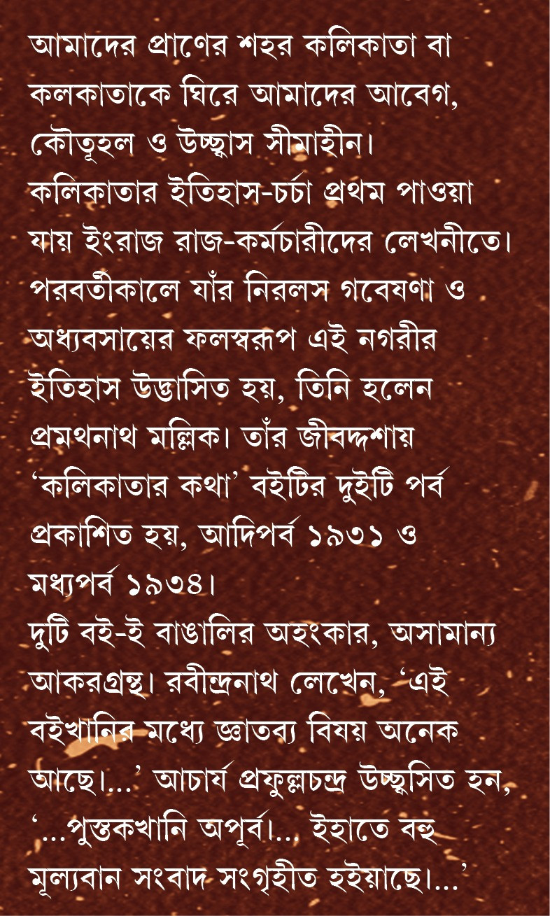 কলিকাতার ইতিহাস-চর্চা প্রথম পাওয়া যায় ইংরাজ রাজ-কর্মচারীদের লেখনীতে। পরবর্তীকালে যাঁর নিরলস গবেষণা ও অধ্যবসায়ের ফলস্বরূপ এই নগরীর ইতিহাস উদ্ভাসিত হয়, তিনি হলেন প্রমথনাথ মল্লিক। তাঁর জীবদ্দশায় 'কলিকাতার কথা' বইটির দুইটি পর্ব প্রকাশিত হয়, আদিপর্ব ১৯৩১ ও মধ্যপর্ব ১৯৩৪।