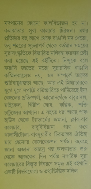 মদপানের কোনো কালবিভাজন হয় না। কলকাতার সুরা কালচার চিরন্তন। নগর প্রতিষ্ঠার বহু আগে থেকে বাঙালি মদ খেতো, তবু শহরের সূচনাপর্ব থেকে বর্তমান সময়ের সুরাসংস্কৃতিকে বিস্তারিত নথিবদ্ধ করবার চেষ্টা করা হয়েছে এই বইটিতে। নিন্দুকে বলে ফরাসি জাতের মতো সুরারসিক বাঙালি কস্মিনকালেও নয়, মদ সম্পর্কে তাদের শুচিবায়ুগ্রস্ততা আছে। আর এই মিথ্যাচারকে যুগে যুগে সপাটে বাউন্ডারিতে পাঠিয়েছে ইয়ং বেঙ্গলের প্রতিস্পর্ধা, আমোদগেঁডে বাবুর দল, মাইকেল, গিরীশ ঘোষ, ঋত্বিক, শক্তি চাটুজ্যের আখ্যান। এ বইতে ধরা আছে পাঞ্চ হাউস থেকে ট্যাভার্নের জমানা, ক্লাব-বার কালচার, বাবুবিবিয়ানা পার করে খালাসীটোলা-বারদুয়ারীর চিরভাস্বর ঐতিহ্য মায় ধেনো'র রেজারেকশন পর্যন্ত। রয়েছে জানা অজানা অজস্র গল্প। কলকাতার শুরু থেকে আজকের দিন পর্যন্ত নাগরিক সুরা কালচারের বিস্তৃত বিবরণে সমৃদ্ধ এই বইখানি একটি নির্ভরযোগ্য ও তথ্যভিত্তিক দলিল