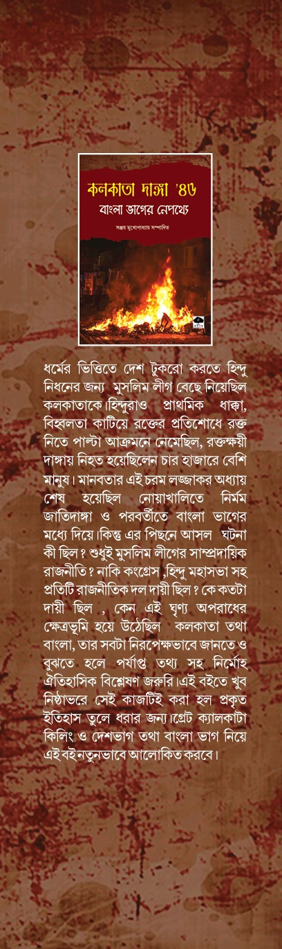 ধর্মের ভিত্তিতে দেশ টুকরো করতে হিন্দু নিধনের জন্য মুসলিম লীগ বেছে নিয়েছিল কলকাতাকে। হিন্দুরাও প্রাথমিক ধাক্কা, বিহ্বলতা কাটিয়ে রক্তের প্রতিশোধে রক্ত নিতে পাল্টা আক্রমনে নেমেছিল, রক্তক্ষয়ী দাঙ্গায় নিহত হয়েছিলেন চার হাজারে বেশি মানুষ। মানবতার এই চরম লজ্জাকর অধ্যায় শেষ হয়েছিল নোয়াখালিতে নির্মম জাতিদাঙ্গা ও পরবর্তীতে বাংলা ভাগের মধ্যে দিয়ে। কিন্তু এর পিছনে আসল ঘটনা কী ছিল? শুধুই মুসলিম লীগের সাম্প্রদায়িক রাজনীতি? নাকি কংগ্রেস, হিন্দু মহাসভা সহ প্রতিটি রাজনীতিক দল দায়ী ছিল? কে কতটা দায়ী ছিল, কেন এই ঘৃণ্য অপরাধের ক্ষেত্রভূমি হয়ে উঠেছিল কলকাতা তথা বাংলা, তার সবটা নিরপেক্ষভাবে জানতে ও বুঝতে হলে পর্যাপ্ত তথ্য সহ নির্মোহ ঐতিহাসিক বিশ্লেষণ জরুরি। এই বইতে খুব নিষ্ঠাভরে সেই কাজটিই করা হল প্রকৃত ইতিহাস তুলে ধরার জন্য। গ্রেট ক্যালকাটা কিলিং ও দেশভাগ তথা বাংলা ভাগ নিয়ে এই বই নতুনভাবে আলোকিত করবে