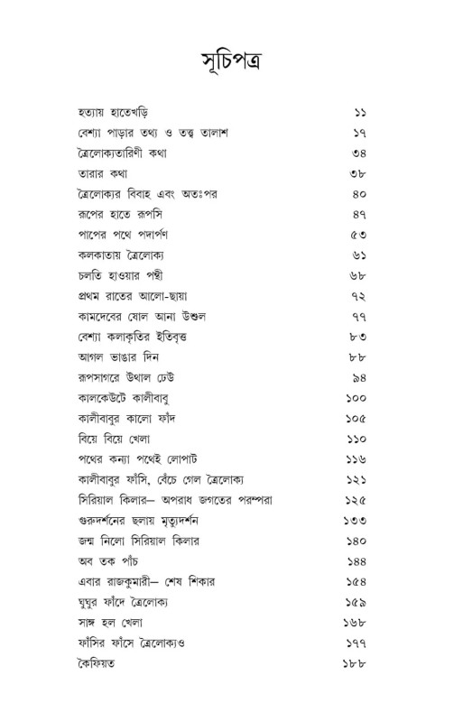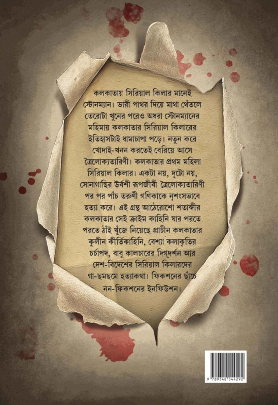 কলকাতায় সিরিয়াল কিলার মানেই স্টোনম্যান। ভারী পাথর দিয়ে মাথা থেঁতলে তেরোটা খুনের পরেও অধরা স্টোনম্যানের মহিমায় কলকাতার সিরিয়াল কিলারের ইতিহাসটাই ধামাচাপা পড়ে। নতুন করে খোদাই-খনন করতেই বেরিয়ে আসে ত্রৈলোক্যতারিণী। কলকাতার প্রথম মহিলা সিরিয়াল কিলার। একটা নয়, দুটো নয়, সোনাগাছির উর্বশী রূপজীবী ত্রৈলোক্যতারিণী পর পর পাঁচ তরুণী গণিকাকে নৃশংসভাবে হত্যা করে। এই গ্রন্থ আঠেরোশো শতাব্দীর কলকাতার সেই ক্রাইম কাহিনি যার পরতে পরতে ঠাঁই খুঁজে নিয়েছে প্রাচীন কলকাতার কুলীন কীর্তিকাহিনি, বেশ্যা কলাকৃতির চর্চাপদ, বাবু কালচারের দিগ্দর্শন আর দেশ-বিদেশের সিরিয়াল কিলারদের গা-ছমছমে হত্যাকথা। ফিকশনের ছাঁচে নন-ফিকশনের ইনফিউশন।
