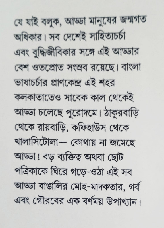 যে যাই বলুক, আড্ডা মানুষের জন্মগত অধিকার। স9ব দেশেই সাহিত্যচর্চা এবং বুদ্ধিজীবিকারেই আড্ডার বেশ ওতপ্রোত সংস্রব রয়েছে। বাংলা ভাষাচর্চার প্রাণকেন্দ্র এই শহর কলকাতাতেও সাবেক কাল থেকেই আড্ডা চলেছে পুরোদমে। ঠাকুরবাড়ি থেকে রায়বাড়ি, কফিহাউস থেকে খালাসিটোলা-- কোথায় না জমেছে আড্ডা!