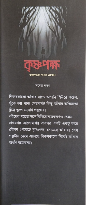 নিকষকালো আঁধার যাতে আপনি শিউরে ওঠেন, ছুঁতে ভয় পান! সেরকমই কিছু আঁধার অভিজ্ঞতা ঢুঁড়ে তুলে এনেছি গল্পদের। বইয়ের গল্পের সাথে মিলিয়ে নামকরণও তেমন। প্রথমগল্প আলোমাখা। তারপর একটু একটু করে যৌবন পেয়েছে কৃষ্ণপক্ষ, নেমেছে আঁধার। শেষ গল্পটায় নেমে এসেছে নিকষকালো নিরেট আঁধার অর্থাৎ অমাবস্যা।