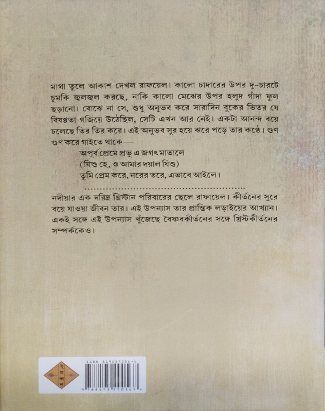 ছোটবেলায় বাবার কাছে শোনা গল্পটা আজও সে ভোলেনি। এই বয়সেও বেশ মনে আছে।। শুয়ে শুয়েই ভাবে, সেই যে বাপের কাছে গানের নাড়া বেঁধেছিল, তার মধ্যেই সে ডুবে গেল। এখন তো শুধু কীর্তন নয়। পালা গানও করে। খ্রিস্টকীর্তন তো কতজনই গায়। এখন তো বাউলও গাইছে। গেরুয়া পরে খ্রিস্টবাউল আসরে আসে খমক কিংবা দোতারা নিয়ে। পিছনে অবশ্য কী-বোর্ড, গিটার, অক্টোপ্যাড নিয়ে বাজনদাররা বাজিয়ে যায়। এদের গানে ভক্তি নেই, আবেগ নেই, শুধু দেখনদারি, আর খ্রিস্টকে নিয়ে ব্যবসা করা। মনে মনে রেগে যায় রাফায়েল। বাপ নিরু বিশ্বাস বলেছিল, যিশুকে নিয়ে ব্যবসা কোরো না বাপ। মনে রেখে খ্রিস্টকীর্তন মানে যিশুর মহিমা গান গাইছ। ভক্তি আর আবেগ না থাকলে যিশুর গান গাওয়া যায় না। হাজার রকমের বাজনা দিয়ে মানুষের মন ভোলানো যায়, ঈশ্বরের কথা বলা যায় না। ঈশ্বর শুধু তোমার গানটাই শুনবে, বাজনা নয়। তোমাকে তিনি সুর দিয়েছেন নিজের মহিমা শোনার জন্যে, এটা মনে রেখো। যেদিন গলা থেকে সুর হারিয়ে যাবে, ছেড়ে দেবে। কীর্তনের জাত মেরো না।