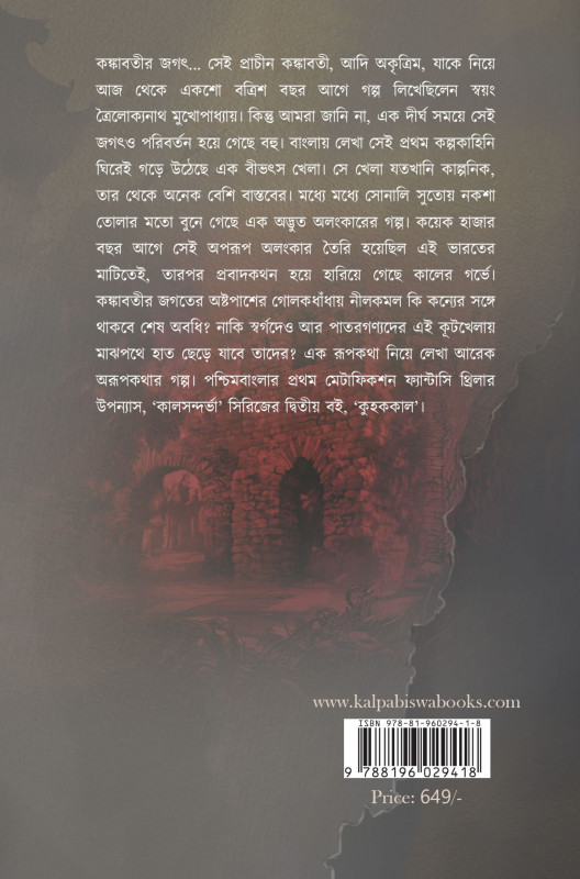 কঙ্কাবতীর জগৎ… সেই প্রাচীন কঙ্কাবতী, আদি অকৃত্রিম, যাকে নিয়ে আজ থেকে একশো বত্রিশ বছর আগে গল্প লিখেছিলেন স্বয়ং ত্রৈলোক্যনাথ মুখোপাধ্যায়। কিন্তু আমরা জানি না, এক দীর্ঘ সময়ে সেই জগৎও পরিবর্তন হয়ে গেছে বহু। বাংলায় লেখা সেই প্রথম কল্পকাহিনি ঘিরেই গড়ে উঠেছে এক বীভৎস খেলা। সে খেলা যতখানি কাল্পনিক, তার থেকে অনেক বেশি বাস্তবের। মধ্যে মধ্যে সোনালি সুতোয় নকশা তোলার মতো বুনে গেছে এক অদ্ভুত অলংকারের গল্প। কয়েক হাজার বছর আগে সেই অপরূপ অলংকার তৈরি হয়েছিল এই ভারতের মাটিতেই, তারপর প্রবাদকথন হয়ে হারিয়ে গেছে কালের গর্ভে। কঙ্কাবতীর জগতের অষ্টপাশের গোলকধাঁধায় নীলকমল কি কন্যের সঙ্গে থাকবে শেষ অবধি? নাকি স্বর্গদেও আর পাতরগণ্যদের এই কূটখেলায় মাঝপথে হাত ছেড়ে যাবে তাদের? এক রূপকথা নিয়ে লেখা আরেক অরূপকথার গল্প। পশ্চিমবাংলার প্রথম মেটাফিকশন ফ্যান্টাসি থ্রিলার উপন্যাস, ‘কালসন্দর্ভা’ সিরিজের দ্বিতীয় বই, ‘কুহককাল’।
