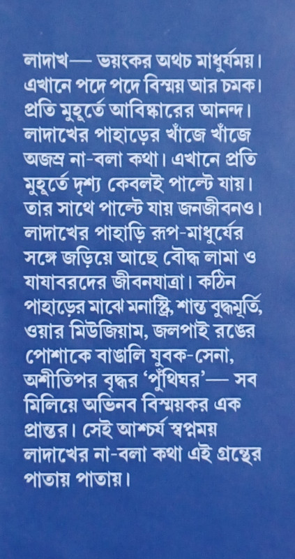 লাদাখ- ভয়ংকর অথচ মাধুর্যময়। এখানে পদে পদে বিস্ময় আর চমক। প্রতি মুহূর্তে আবিষ্কারের আনন্দ। লাদাখের পাহাড়ের খাঁজে খাঁজে অজস্র না-বলা কথা। এখানে প্রতি মুহূর্তে দৃশ্য কেবলই পাল্টে যায়। তার সাথে পাল্টে যায় জনজীবনও। লাদাখের পাহাড়ি রূপ-মাধুর্যের সঙ্গে জড়িয়ে আছে বৌদ্ধ লামা ও যাযাবরদের জীবনযাত্রা। কঠিন পাহাড়ের মাঝে মনাস্ট্রি, শান্ত বুদ্ধমূর্তি, ওয়ার মিউজিয়াম, জলপাই রঙের পোশাকে বাঙালি যুবক-সেনা, অশীতিপর বৃদ্ধর 'পুঁথিঘর'- সব মিলিয়ে অভিনব বিস্ময়কর এক প্রান্তর। সেই আশ্চর্য স্বপ্নময় লাদাখের না-বলা কথা এই গ্রন্থের পাতায় পাতায়।