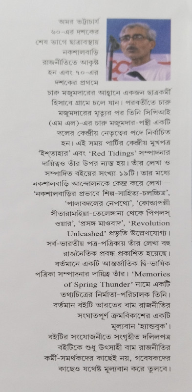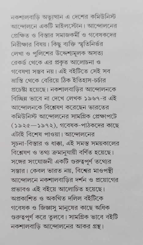 নকশালবাড়ি অভ্যুত্থান এ দেশের কমিউনিস্ট আন্দোলনে একটি মাইলস্টোন। আন্দোলনের প্রেক্ষিত ও বিস্তার সমাজকর্মী ও গবেষকদের নিরীক্ষার বিষয়। কিছু ব্যক্তি স্মৃতিনির্ভর লেখা ও পুলিশের উদ্দেশ্যমূলক অসত্য রেকর্ড থেকে এর প্রকৃত আলোচনা ও গবেষণা সম্ভব নয়। এই বইটিতে সেই সব ভ্রান্তি থেকে বেরিয়ে ঠিক ইতিহাস-চর্চার প্রচেষ্টা হয়েছে। নকশালবাড়ির আন্দোলনকে বিচ্ছিন্ন ভাবে না দেখে লেখক ১৯৬৭-র এই আন্দোলনকে বিশ্লেষণ করেছেন ভারতের কমিউনিস্ট আন্দোলনের সামগ্রিক প্রেক্ষাপটে (১৯২৫-১৯৭২), গবেষক-পাঠকদের কাছে এটাই বিশেষ পাওয়া। আন্দোলনের সূচনা-বিস্তার ও ধাক্কা, এই সমস্ত সময়কালের বিশ্লেষণ ও তথ্য ক্রমানুযায়ী বর্ণিত হয়েছে। সঙ্গের সংযোজনী একটি গুরুত্বপূর্ণ তথ্যের সম্ভার। কেবল ভারত নয়, বিশ্বের মাওপন্থী আন্দোলনে নকশালবাড়ির দর্শন ও প্রয়োগের প্রভাবও এই বইয়ে আলোচিত হয়েছে। অপ্রকাশিত ও অকথিত দলিল বইটিকে গবেষক ও জিজ্ঞাসু মানুষের কাছে অধিক গুরুত্বপূর্ণ করে তুলবে। সামগ্রিক ভাবে বইটি নকশালবাড়ি আন্দোলনের আকর গ্রন্থ।