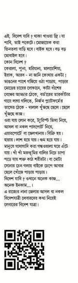 দালাল, দালালের আন্ডারে আবার দালাল, বড় দালাল তার মাসতুতো, ভাই, শালা, জামাই, খুড়ো, মোজায়েক করা বাড়ি, ফেক পাসপোর্ট, লোন, লোন শোধ দিতে আবার লোন এসব নিয়েই চলছে লটারি কাটার মতো রাজ্যের পাড়া পাড়া থেকে লেবারের বিদেশ যাত্রা। কখনও দেশের অন্য রাজ্যগুলোই বিদেশ। কখনও মোকামা কার্ড, উট, বালি, মরুভূমি, ছাগল, সোনা, ডলার, কফিনে ভরা ডেডবডির সত্যিকারের বিদেশ।