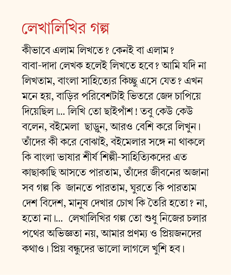 কীভাবে এলাম লিখতে? কেনই বা এলাম? বাবা-দাদা লেখক হলেই লিখতে হবে? আমি যদি না লিখতাম, বাংলা সাহিত্যের কিচ্ছু এসে যেত? এখন মনে হয়, বাড়ির পরিবেশটাই ভিতরে জেদ চাপিয়ে দিয়েছিল।… লিখি তো ছাইপাঁশ! তবু কেউ কেউ বলেন, বইমেলা ছাড়ুন, আরও বেশি করে লিখুন। তাঁদের কী করে বোঝাই, বইমেলার সঙ্গে না থাকলে কি বাংলা ভাষার শীর্ষ শিল্পী-সাহিত্যিকদের এত কাছাকাছি আসতে পারতাম, তাঁদের জীবনের অজানা সব গল্প কি জানতে পারতাম, ঘুরতে কি পারতাম দেশ বিদেশ, মানুষ দেখার চোখ কি তৈরি হতো? না, হতো না।… লেখালিখির গল্প তো শুধু নিজের চলার পথের অভিজ্ঞতা নয়, আমার প্রণম্য ও প্রিয়জনদের কথাও। প্রিয় বন্ধুদের ভালো লাগলে খুশি হব।