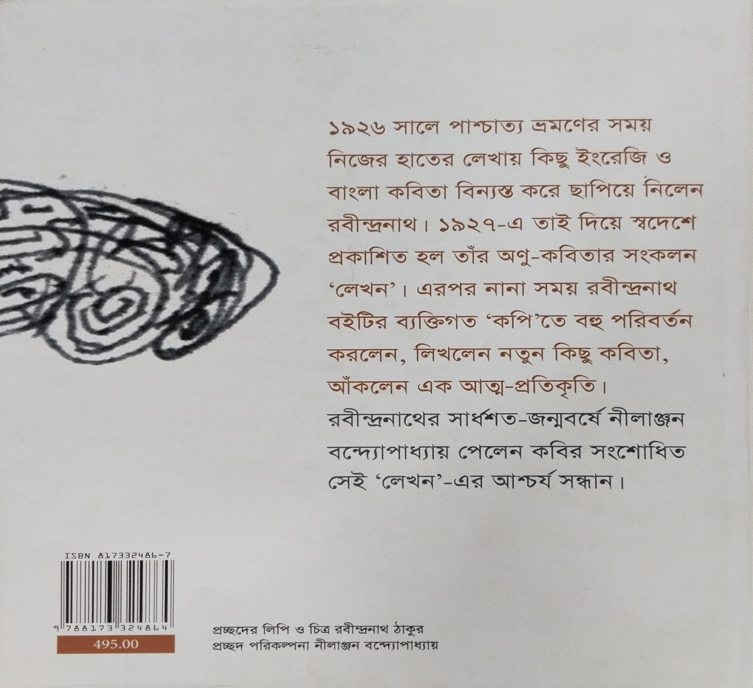 ১৯২৬ সালে পাশ্চাত্য ভ্রমণের সময় নিজের হাতের লেখায় কিছু ইংরেজি ও বাংলা কবিতা বিন্যস্ত করে ছাপিয়ে নিলেন রবীন্দ্রনাথ। ১৯২৭-এ তাই দিয়ে স্বদেশে প্রকাশিত হল তাঁর অণু-কবিতার সংকলন 'লেখন'। এরপর নানা সময় রবীন্দ্রনাথ বইটির ব্যক্তিগত 'কপি'তে বহু পরিবর্তন করলেন, লিখলেন নতুন কিছু কবিতা, আঁকলেন এক আত্ম-প্রতিকৃতি।