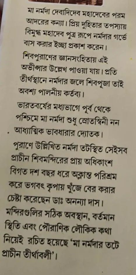 পুরাণে উল্লিখিত নর্মদা তটস্থিত সেইসব প্রাচীন শিবমন্দিরের প্রায় অধিকাংশ বিগত দশ বছর ধরে অক্লান্ত পরিশ্রম করে ভগবৎ কৃপায় খুঁজে বের করার চেষ্টা করেছেন ডাঃ অনন্যা দাস। মন্দিরগুলির সঠিক অবস্থান, বর্তমান স্থিতি এবং পৌরাণিক লৌকিক কথা নিয়েই রচিত হয়েছে 'মা নর্মদার তটে প্রাচীন তীর্থাবলী'।
