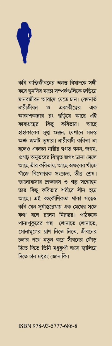 কবি ব্যক্তিজীবনের অনন্ত বিষাদকে সঙ্গী করে ঘুনসির মতো সম্পর্কগুলিকে জড়িয়ে মানবজীবন আবাদে যেতে চান। বেদনার্ত নারীজীবন ও একাকীত্বের এক আকাশকান্নার রং ছড়িয়ে আছে এই কাব্যগ্রন্থের কিছু কবিতায়। আছে হাহাকারের সুপ্ত গুঞ্জন, যেখানে সমস্ত অশ্রু জমাট তুষার। নারীবাদী কবিতা না হলেও একজন নারীর স্বগত স্বনন, জখম, প্রগাঢ় অনুভবের বিস্মৃত জগৎ ডানা মেলে আছে তাঁর কবিতায়, আছে অক্ষরের খাঁজে খাঁজে বিস্ফোরক সংকেত, তীব্র শ্লেষ। ভালোবাসার দ্রাক্ষারস ও গাঢ় সম্মোহন তার কিছু কবিতার শরীরে লীন হয়ে আছে। এই বহুকৌণিকতা থাকা সত্ত্বেও কবি যেন সূর্যাস্তরেখায় এক মেঘের সঙ্গে কথা বলে চলেন নিরন্তর। পাঠককে পানাপুকুরের গল্প শোনাতে শোনাতে, সোনামুগের ঘ্রাণ নিতে নিতে, জীবনের চলার পথে নতুন করে সীবনের ফোঁড় দিতে দিতে তিনি মধুকূপী ঘাসে জ্বালিয়ে দিতে চান মধুরং জোনাকি।