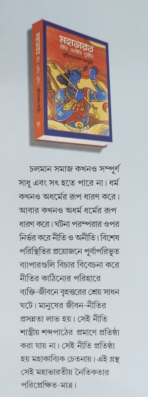 চলমান সমাজ কখনও সম্পূর্ণ সাধু এবং সৎ হতে পারে না। ধর্ম কখনও অধর্মের রূপ ধারণ করে। আবার কখনও অধর্ম ধর্মের রূপ ধারণ করে। ঘটনা পরম্পরার ওপর নির্ভর করে নীতি ও অনীতি। বিশেষ পরিস্থিতির প্রয়োজনে পূর্বাপরিভূত ব্যাপারগুলি বিচার বিবেচনা করে নীতির কাঠিন্যের পরিহারে ব্যক্তি-জীবনে বৃহত্তরের শ্রেয় সাধন ঘটে। মানুষের জীবন-নীতির প্রসন্নতা লাভ হয়। সেই নীতি শাস্ত্রীয় শব্দপাঠের প্রমাণে প্রতিষ্ঠা করা যায় না। সেই নীতি প্রতিষ্ঠা হয় মহাকাব্যিক চেতনায়। এই গ্রন্থ সেই মহাভারতীয় নৈতিকতার পরিপ্রেক্ষিত-মাত্র।