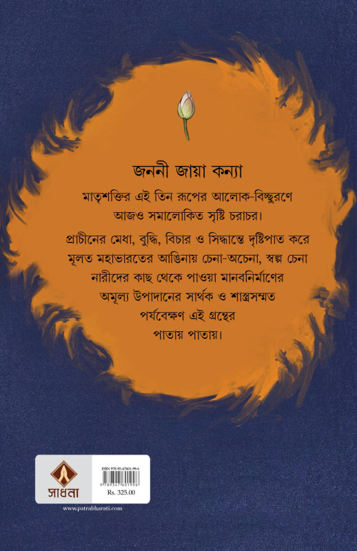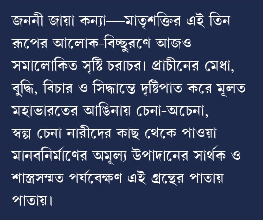 জননী জায়া কন্যা-মাতৃশক্তির এই তিন রূপের আলোক-বিচ্ছুরণে আজও সমালোকিত সৃষ্টি চরাচর। প্রাচীনের মেধা, বুদ্ধি, বিচার ও সিদ্ধান্তে দৃষ্টিপাত করে মূলত মহাভারতের আঙিনায় চেনা-অচেনা, স্বল্প চেনা নারীদের কাছ থেকে পাওয়া মানবনির্মাণের অমূল্য উপাদানের সার্থক ও শাস্ত্রসম্মত পর্যবেক্ষণ এই গ্রন্থের পাতায় পাতায়।