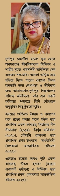 দুর্গাপুর হেমশীলা মডেল স্কুল থেকে অবসরপ্রাপ্ত জীববিজ্ঞানের শিক্ষিকা ও শাস্ত্রীয় নৃত্যে পারদর্শিনী অনিন্দিতা সেন একজন শব্দ-চাষি। আবেগ তাড়িত হয়ে ছড়িয়ে দিতে পারেন চোখের ভিতর বানভাসি জল! লেখাপড়া ও জীবিকার জন্য আসানসোল-দুর্গাপুর শিল্পাঞ্চলের বাসিন্দা অনিন্দিতা। তাঁর এক একটি কবিতার ঋজুমন্ত্রে তিনি বেঁধেছেন অনুভূতির কিছু টুকরো স্মৃতি।