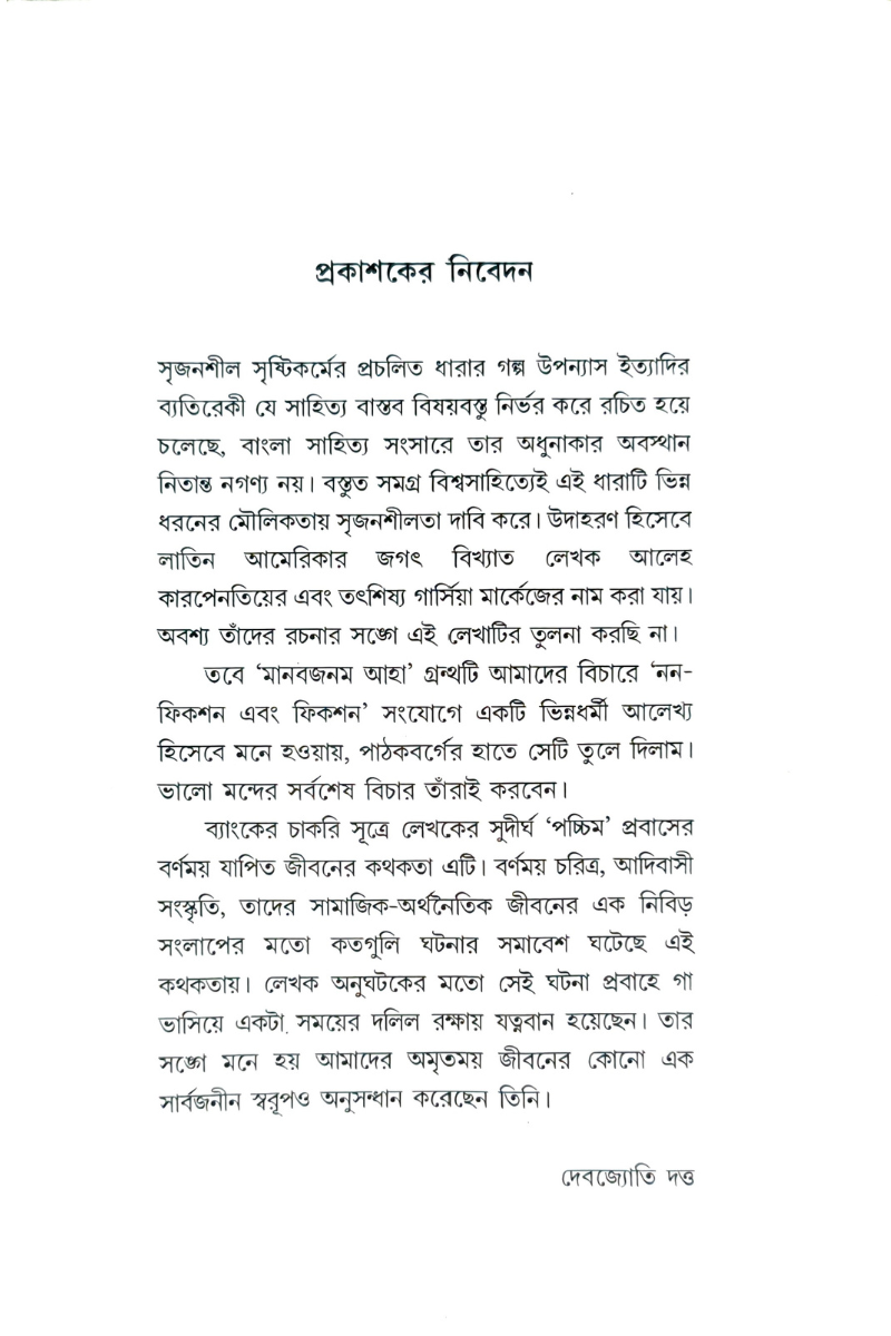 “এমন মানব জমিন রইল পতিত আবাদিলে ফলতো সোনা”—লেখক মিহির সেনগুপ্তর আত্মপোলব্ধির ফসলই হল “মানব জনম আহা” বইটি। লেখকের কর্মক্ষেত্রের বদলীসূত্রে মানভূমের জনজীবনের অন্দর মহলে অনায়াস প্রবেশ এবং আদিবাসীগোষ্ঠী বা সম্প্রদায়ের দৈনন্দিন সুখ দুঃখ ও সংস্কৃতির ত্রিবেণী জীবনকেই মুখরিত করেছেন—আত্মকথনের মোড়কে ঢাকা বিষয়বস্তুর বিস্তারে—যা পাঠক কে দেবে এই ভারতের এক অজানাকে জানার সন্ধান।
