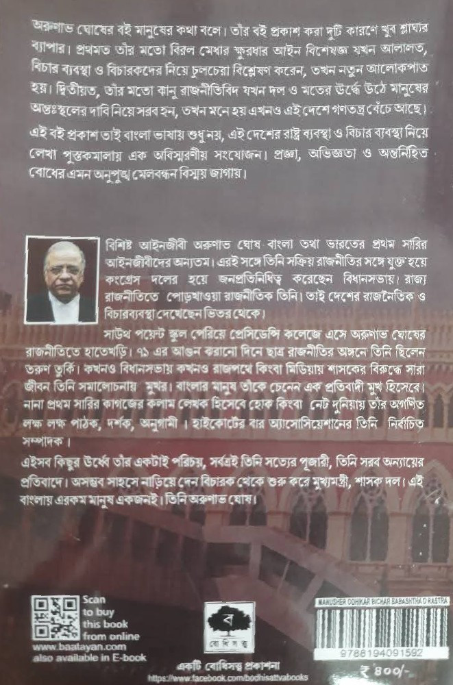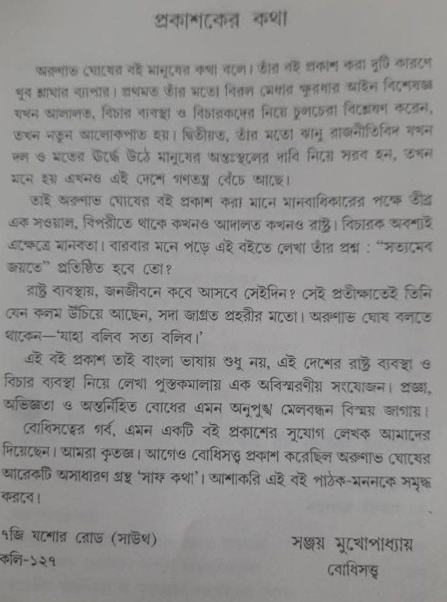 অরুণাভ ঘোষের বই মানুষের কথা বলে। তাঁর বই প্রকাশ করা দুটি কারণে খুব শ্লাঘার ব্যাপার। প্রথমত তাঁর মতো বিরল মেধার ক্ষুরধার আইন বিশেষজ্ঞ যখন আলালত, বিচার ব্যবস্থা ও বিচারকদের নিয়ে চুলচেরা বিশ্লেষণ করেন,