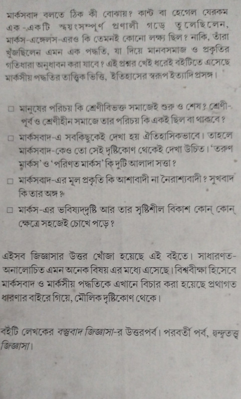 এইসব জিজ্ঞাসার উত্তর খোঁজা হয়েছে এই বইতে। সাধারণত-অনালোচিত এমন অনেক বিষয় এর মধ্যে এসেছে। বিশ্ববীক্ষা হিসেবে মার্কসবাদ ও মার্কসীয় পদ্ধতিকে এখানে বিচার করা হয়েছে প্রথাগত ধারণার বাইরে গিয়ে, মৌলিক দৃষ্টিকোণ থেকে।