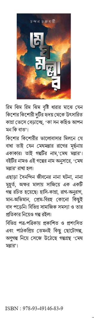 বিভিন্ন পত্র-পত্রিকায় প্রকাশিত ও প্রশংসিত এবং পাঠকপ্রিয় তেমনই কিছু ছোটোগল্প, অণুগল্প নিয়ে সেজে উঠেছে গল্পগ্রন্থ 'মেঘ মল্লার'।