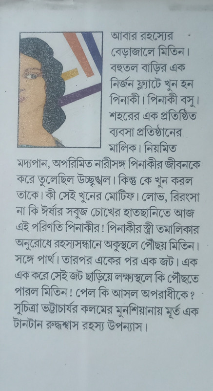 আবার রহস্যের বেড়াজালে মিতিন। বহুতল বাড়ির এক নির্জন ফ্ল্যাটে খুন হন পিনাকী। পিনাকী বসু। শহরের এক প্রতিষ্ঠিত ব্যাবসা প্রতিষ্ঠানের মালিক। নিয়মিত মদ্যপান, অপরিমিত নারীসঙ্গ পিনাকীর জীবনকে করে তুলেছিল উচ্ছৃঙ্খল। কিন্তু কে খুন করল তাকে। কী সেই খুনের মোটিফ। লোভ, রিরংসা না কি ঈর্ষার সবুজ চোখের হাতছানিতে আজ এই পরিণতি পিনাকীর! পিনাকীর স্ত্রী তমালিকার অনুরোধে রহস্যসন্ধানে অকুস্থলে পৌঁছয় মিতিন। সঙ্গে পার্থ। তারপর একের পর এক জট। এক এক করে সেই জট ছাড়িয়ে লক্ষ্যস্থলে কি পৌঁছতে পারল মিতিন! পেল কি আসল অপরাধীকে? সুচিত্রা ভট্টাচার্যর কলমের মুনশিয়ানায় মূর্ত এক টানটান রুদ্ধশ্বাস রহস্য উপন্যাস।
