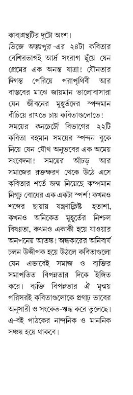 ভিজে অন্তঃপুর-এর ২৪টা কবিতার বেশিরভাগই আর্দ্র সংরাগ ছুঁয়ে যেন প্রেমের এক অনন্ত যাত্রা! যৌনতার দিগন্ত পেরিয়ে পরাপৃথিবী আর বাস্তবের মাঝে জায়মান ভালোবাসারা যেন জীবনের মুহূর্তদের স্পন্দমান বাঁচিয়ে রাখতে চায় কবিতাগুলোতে!