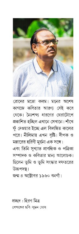 রোদের মতো কলম। মনের অশেষ কাগজে কবিতার আরণ্য সেই কবে থেকে। নৈঃশব্দ্য ধারণের ঘেরাটোপে প্রকাশিত হচ্ছিল এখানে সেখানে। শাঁখে ফুঁ দেওয়ার ইচ্ছে এল বিলম্বিত কালের পরে। নীলিমায় এখন বৃষ্টি। দীপক ও মল্লারের হরিণী মূর্ছনা এক সঙ্গে।