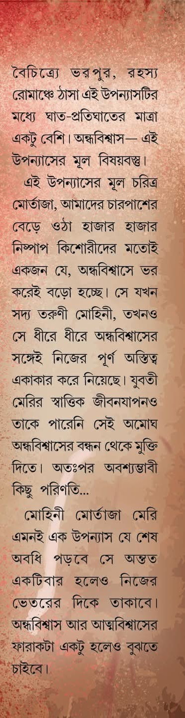 মোহিনী মোর্তাজা মেরি এমনই এক উপন্যাস যে শেষ অবধি পড়বে সে অন্তত একটিবার হলেও নিজের ভেতরের দিকে তাকাবে। অন্ধবিশ্বাস আর আত্মবিশ্বাসের ফারাকটা একটু হলেও বুঝতে চাইবে।