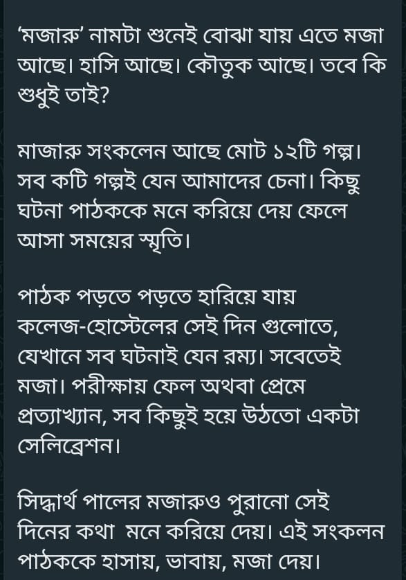সিদ্ধার্থ পালের মজারুও পুরানো সেই দিনের কথা মনে করিয়ে দেয়। এই সংকলন পাঠককে হাসায়, ভাবায়, মজা দেয়।