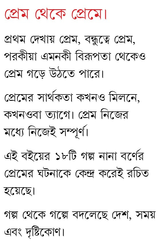 এই বইয়ের ১৮টি গল্প নানা বর্ণের প্রেমের ঘটনাকে কেন্দ্র করেই রচিত হয়েছে।